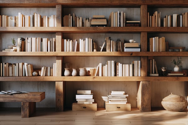 全棚板の水平を確認し、シンプル本棚が正しく組み上がっているか最終チェックします。壁固定がしっかりしているか手で押して確認します。