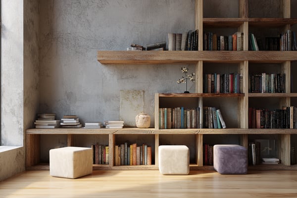 全棚板の水平を確認し、飾り棚一体型本棚が正しく組み上がっているか最終チェックします。壁固定がしっかりしているか手で押して確認します。
