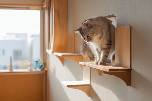 壁付けキャットステップを揺らして安定性を確認します。全ジョイント部のビスを再度増し締めします。猫を乗せる前に荷重テスト(猫の体重以上の重りで5分以上)を実施します。