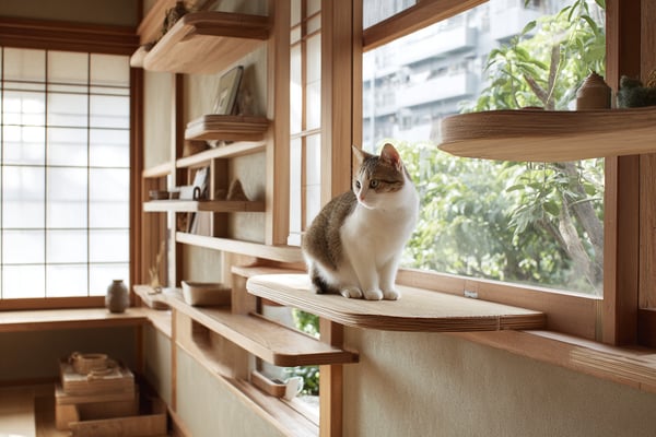 窓際キャットステップを揺らして安定性を確認します。全ジョイント部のビスを再度増し締めします。猫を乗せる前に荷重テスト(猫の体重以上の重りで5分以上)を実施します。