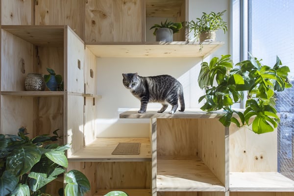 コーナーキャットシェルフを揺らして安定性を確認します。全ジョイント部のビスを再度増し締めします。猫を乗せる前に荷重テスト(猫の体重以上の重りで5分以上)を実施します。