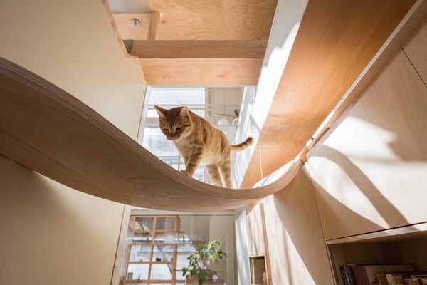 吊り橋式キャットウォークを揺らして安定性を確認します。全ジョイント部のビスを再度増し締めします。猫を乗せる前に荷重テスト(猫の体重以上の重りで5分以上)を実施します。