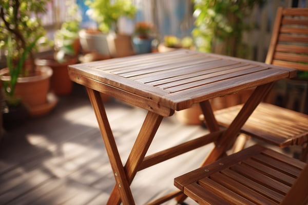 フォールディングガーデンテーブルの水平とガタつきを確認します。脚底にフェルトパッドを貼ると床傷を防げます。