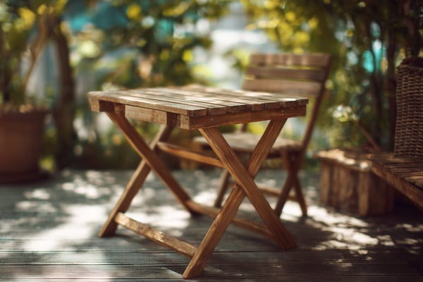 カフェ風ガーデンテーブルの水平とガタつきを確認します。脚底にフェルトパッドを貼ると床傷を防げます。