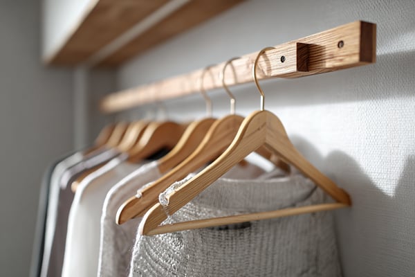 全棚板の水平を確認し、2段ハンガーラックが正しく組み上がっているか最終チェックします。壁固定がしっかりしているか手で押して確認します。