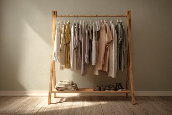 全棚板の水平を確認し、シューズ付きハンガーラックが正しく組み上がっているか最終チェックします。壁固定がしっかりしているか手で押して確認します。
