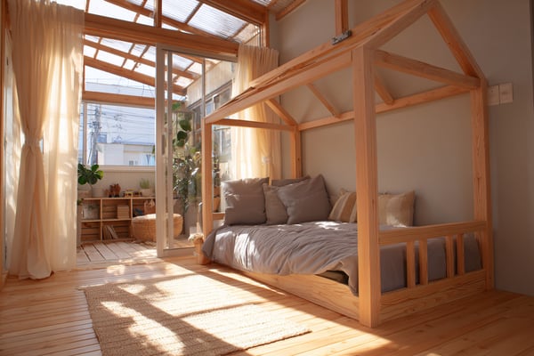 子供用ベッドフレームを設置場所に置き、水平を確認します。ガタつきがある場合は脚底に高さ調整パッドを貼って対応します。