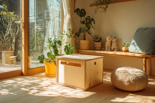 子供用おもちゃ箱の各面の垂直・蓋の開閉確認・ビス締めの確認を行います。設置場所に置いてガタつきがないか確認します。