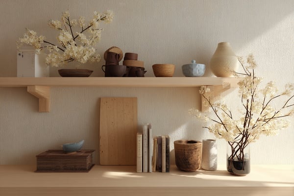 全棚板の水平を確認し、シンプル壁面棚が正しく組み上がっているか最終チェックします。壁固定がしっかりしているか手で押して確認します。