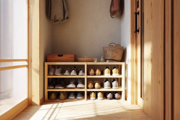 玄関シューズラックの各面の垂直・蓋の開閉確認・ビス締めの確認を行います。設置場所に置いてガタつきがないか確認します。