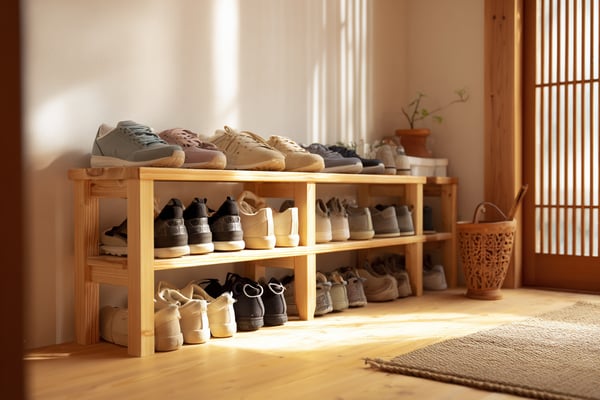 アウトドアシューズラックの各面の垂直・蓋の開閉確認・ビス締めの確認を行います。設置場所に置いてガタつきがないか確認します。