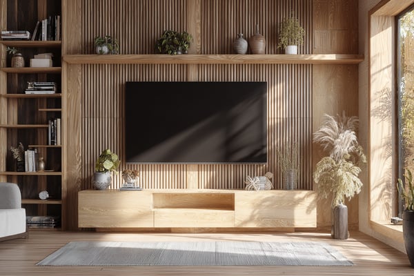 リビング収納ボードの水平・ガタつきを確認します。脚底にフェルトまたはゴムパッドを貼ります。配線穴が必要な場合はホールソーで開けます。