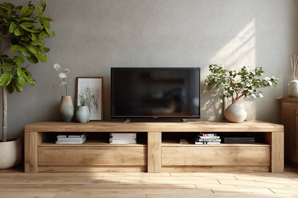 収納付きローボードの水平・ガタつきを確認します。脚底にフェルトまたはゴムパッドを貼ります。配線穴が必要な場合はホールソーで開けます。