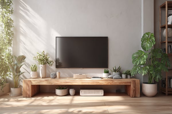 壁掛け風TV台の水平・ガタつきを確認します。脚底にフェルトまたはゴムパッドを貼ります。配線穴が必要な場合はホールソーで開けます。